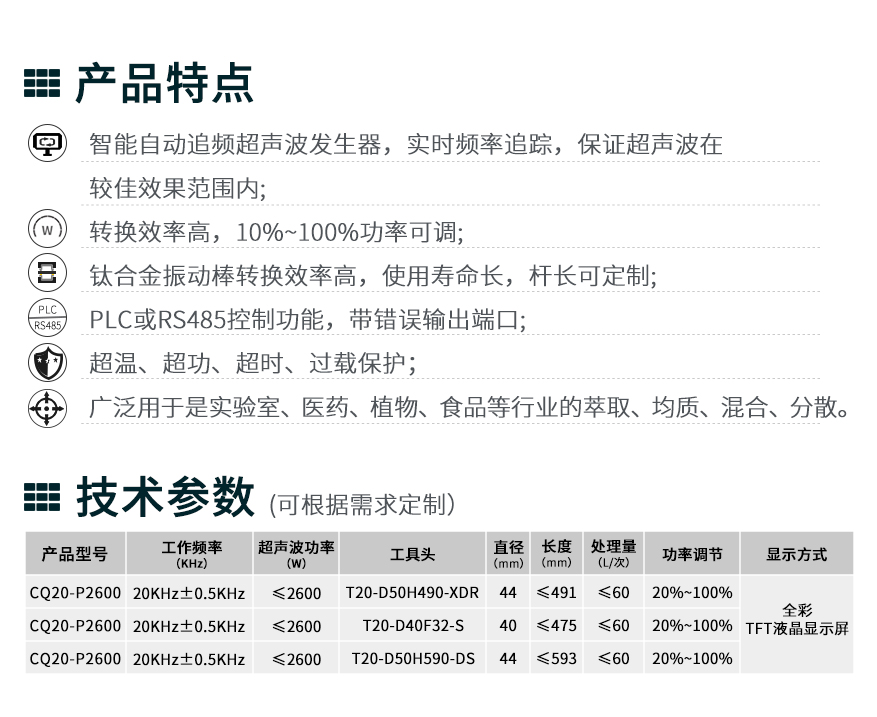 CQ20超声波萃取系统是一款针对于萃取设备配套的超声波产品。智能自动追频超声波发生器、高Q值大功率换能器、钛合金萃取工具头组成的超声波核心配件应用于萃取、匀化、搅拌、乳化等方面都有良好的表现。系统自动追频、功率可调、振幅可调、异常报警等功能。配备RS485通讯可以通过HMI更改和观察各项参数。