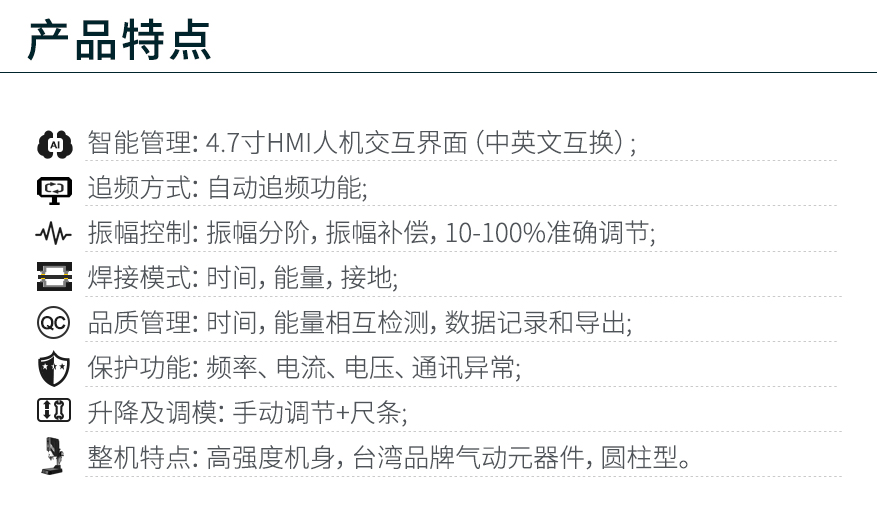 H40/H40S系列搭载了新一代数字化超声波发生器和高Q值超声波换能器;同时全系标配4.3寸HMI人机交付界面,实现可视化操作和控制;分体式设计和水平调控系统的加入,满足大多数现场焊接需求。始终保持高效、易用、稳定、经济的产品特征,广受市场信赖。
