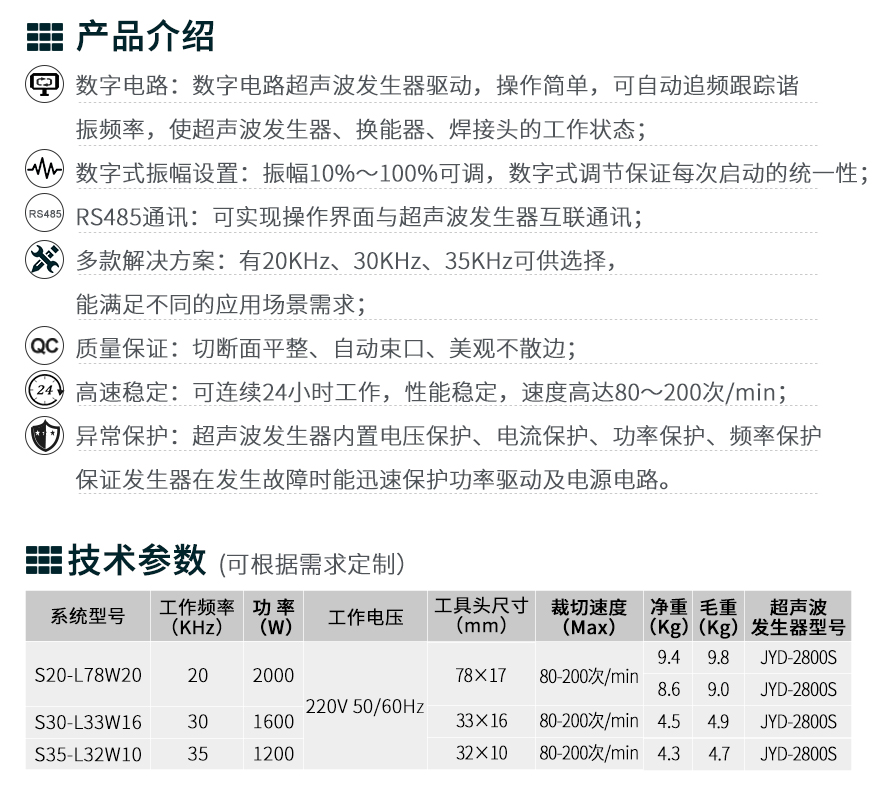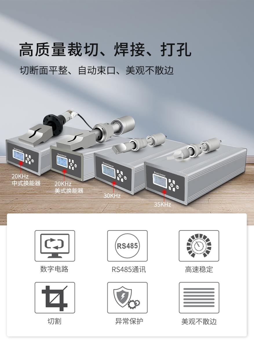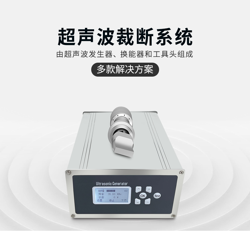 佳源达超声波裁断系统由超声波发生器、换能器和工具头组成,该系统拥有20KHz、30KHz、35KHz多款解决方案,能满足不同的应用场景需求。系统采用数字电路超声波发生器驱动,操作简单,可自动追频跟踪最佳谐振频率,保证超声波发生器、换能器、焊接头在最佳的工作状态;数字式振幅设置,振幅10%~100%可调,数字式调节保证每次启动的统一性;带RS485通讯,可实现操作界面与超声波发生器互联通讯;大功率高Q值换能器、输出功率强劲、工作稳定;超声波发生器内置电压保护、电流保护、功率保护、频率保护、保证超声波发生器在