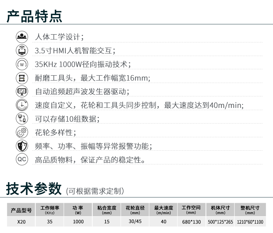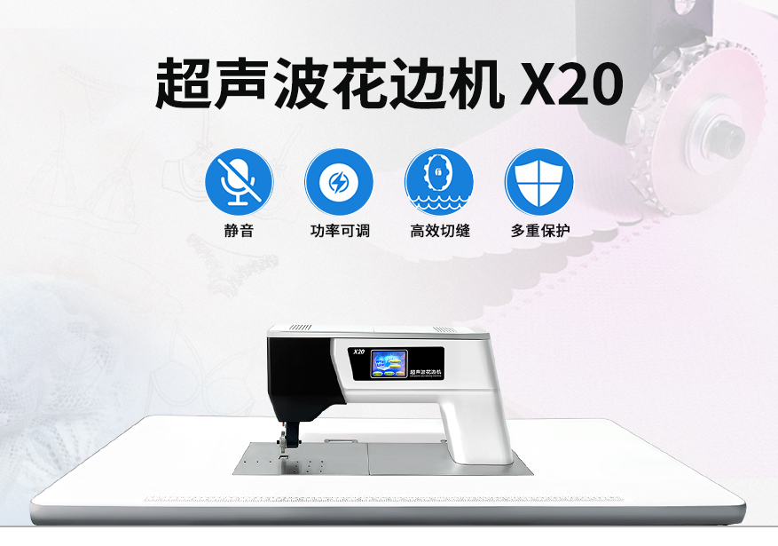 X20超声波花边机是一款35khz智能型超声波焊接机器。智能追频超声波发生器,高Q值换能器,耐磨工具头组成的超声波核心部件,不管应用于切割、焊接、缝合都有良好的表现。整机HMI控制、速度自定义、数据存储、压力调节、花轮多样性、异常报警等功能。